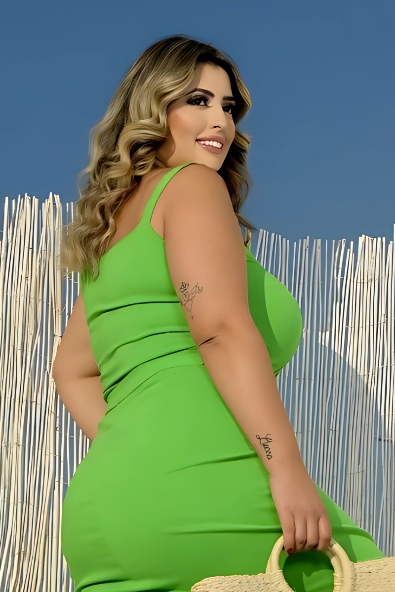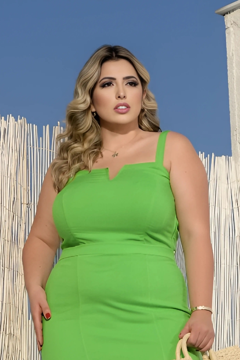 Viscose e elastano com decote em V e zíper posterior.