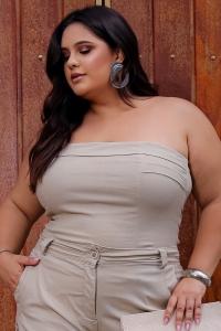 Viscose, linho e elastano. Elastex e zíper posteriores, detalhe de recorte no busto e prega embutida.