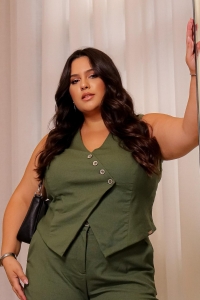 Viscose, linho e elastano. Barra frontal com recorte de bico, gola V e botões frontais para abertura e fechamento.