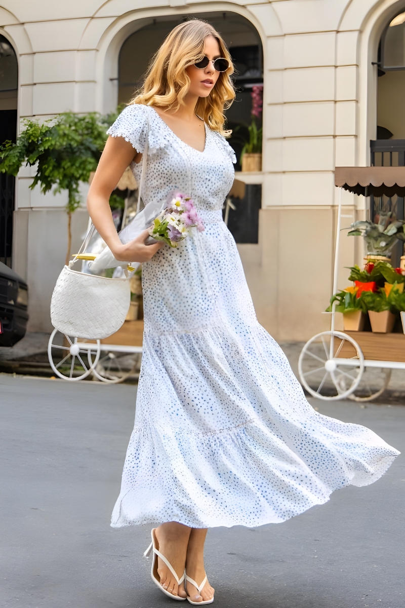 Confeccionado em 100% viscose com estampa poá, este modelo é a escolha perfeita para um visual leve e sofisticado. Possui forro em poliéster e delicados detalhes em renda nas mangas e no corpo, que trazem um charme romântico à peça. O busto ajustado, o caimento fluido e o zíper posterior completam o design com elegância e conforto.