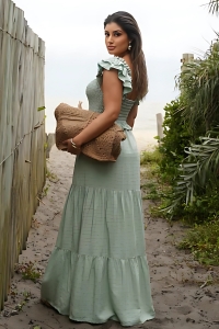 Vestido longo estilo três marias, confeccionado em viscose e algodão com forro em poliéster. Possui busto em lastex que garante ajuste perfeito ao corpo, alças com babados delicados e tecido com textura sutil que valoriza ainda mais a peça. O barrado em camadas traz fluidez e movimento, resultando em um modelo leve, confortável e cheio de charme para diversas ocasiões.
